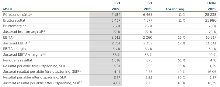 ·          Den justerade EBITA-marginalen1,2 uppgick till 38 procent (36), exklusive IAC2 om 139 MSEK. EBITA1 uppgick till 2 612 MSEK (2 260), motsvarande en marginal om 36 procent (35). EBIT uppgick till 1 868 MSEK (1 358)